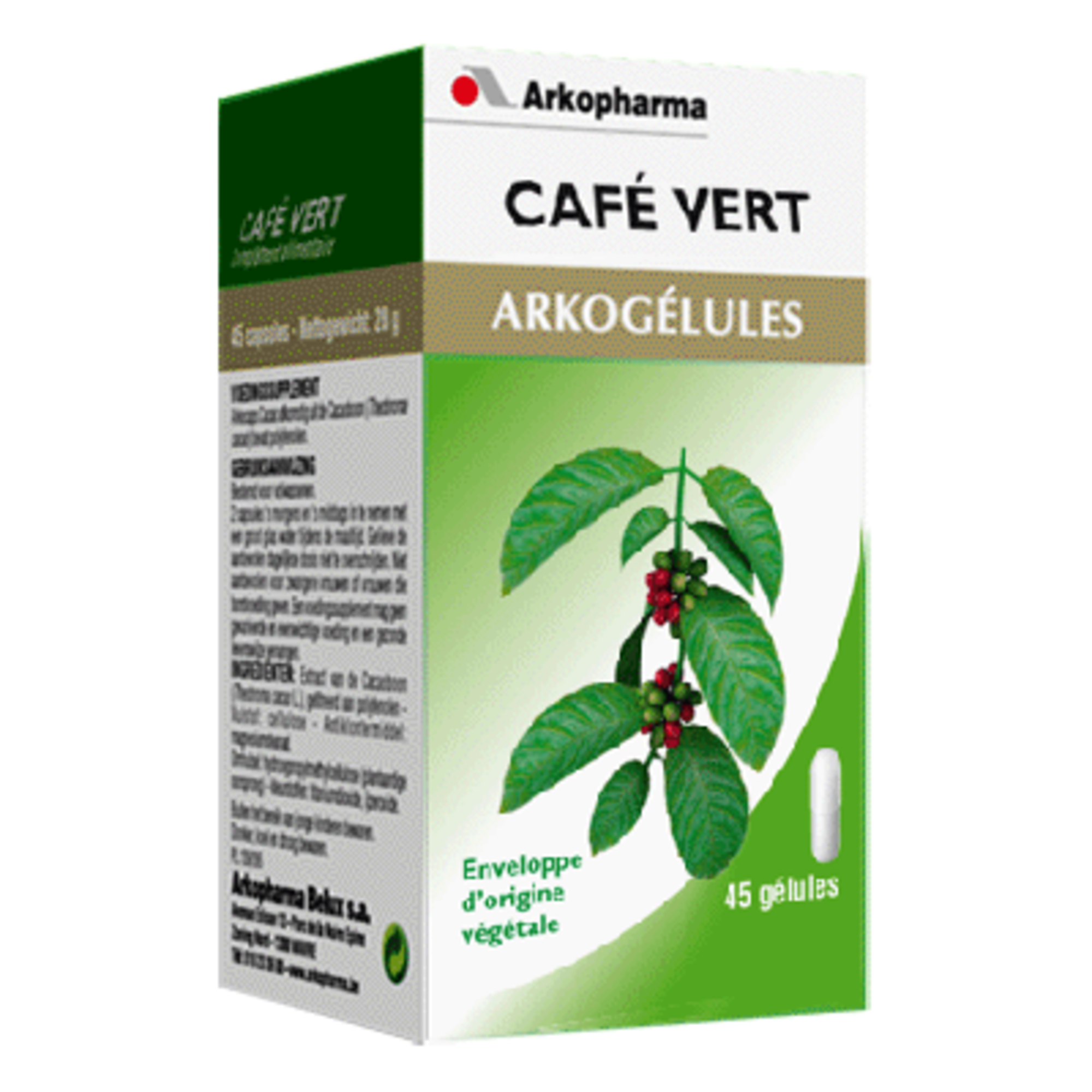 ARKOGELULES Café Vert est un complément alimentaire de la marque Arkopharma sous forme de gélules. Le Café vert est une graine nature et non torréfiée, issu des précieux grains de la variété robusta (Coffea canephora L.). Sans torréfaction, il garde toutes les substances synthétisées par le cafetier lors de sa croissance.