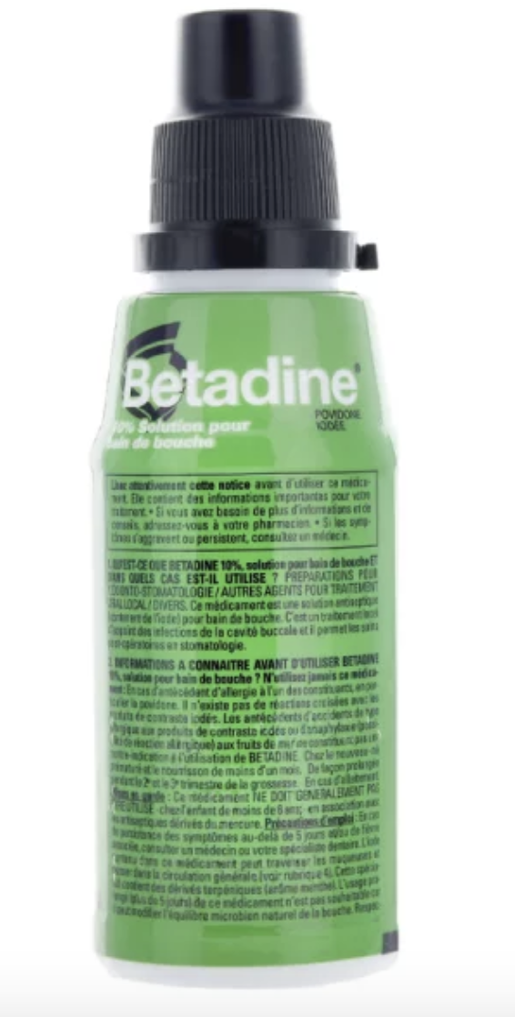 L’utilisation prolongée de ce bain de bouche antiseptique peut entrainer un déséquilibre de la flore bactérienne naturellement présente dans la bouche avec un risque de développer une mycose buccale. L’utilisation de la Bétadine verte bain de bouche à partir du second trimestre de la grossesse n’est pas recommandée en raison de la présence d’iode dans la formule. Pour les mêmes raison, on évitera son emploi pendant l’allaitement. Un traitement prolongée peut avoir pour conséquences un passage d’iode dans la circulation sanguine donc un dérèglement de la thyroïde. L’arôme de menthe contient des dérivés terpéniques : demander un avis médical en cas d’antécédents d’épilepsie ou de convulsions. Ne pas utiliser la Bétadine verte en cas d’allergie à l’un des composants notamment l’iode. Avant d’utiliser ce médicament, il faut lire attentivement la notice. En cas de doute, vous pouvez interroger votre pharmacien ou demander l’avis de votre médecin.