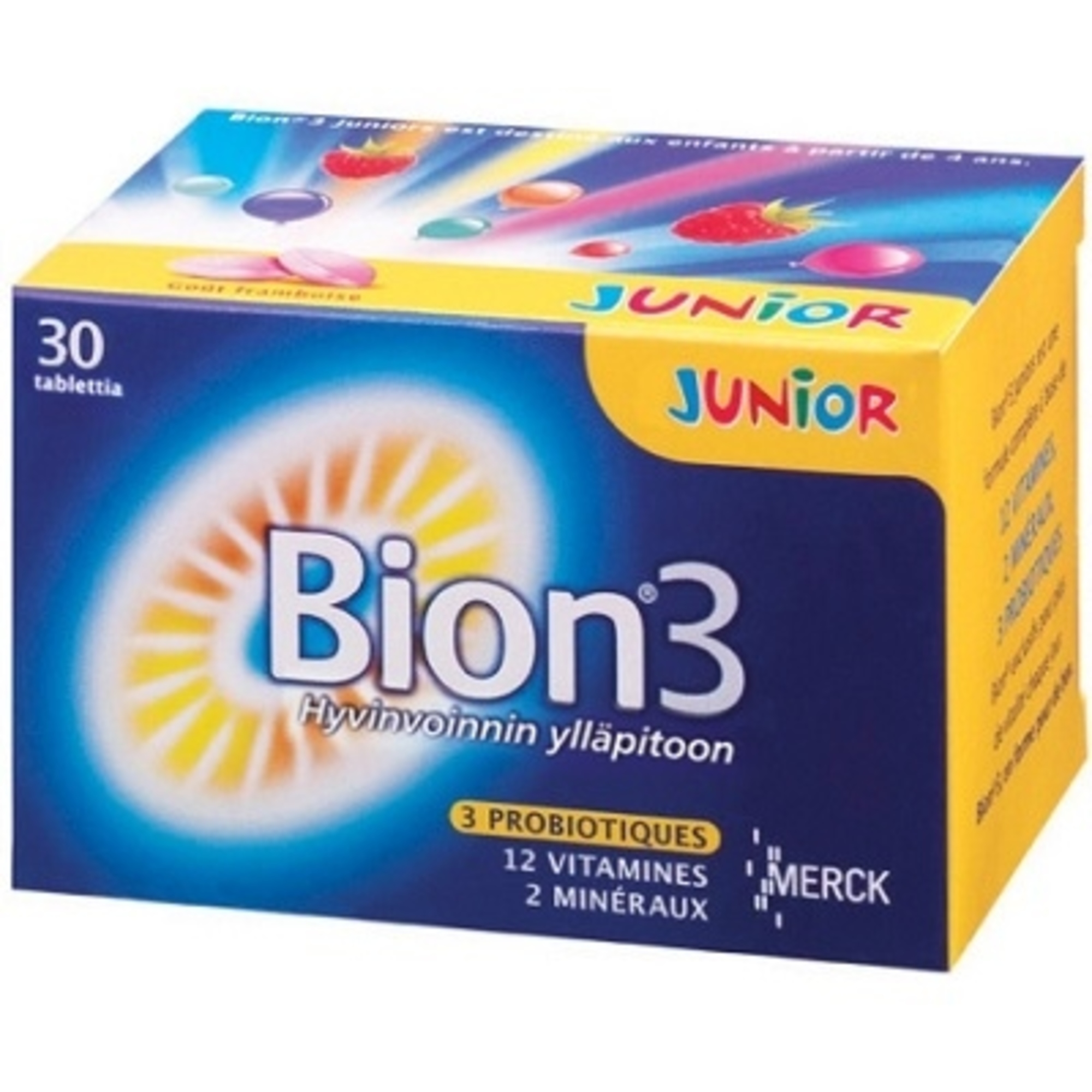 BION 3 Défense Junior est un complément alimentaire sous forme de comprimés. Il associe : ? 3 ferments Tri-Bion® brevetés : Lactobacillus gasseri PA 16/8, Bi?dobacterium bi?dum MF 20/5, Bifidobacterium longum SP 07/3 ? 12 vitamines : A, B1, B2, B3, B5, B6, B8, B9, B12, C, D, E et 2 minéraux : fer et zinc. BION 3 Défense Junior convient parfaitement aux adultes et aux enfants dès 4 ans.