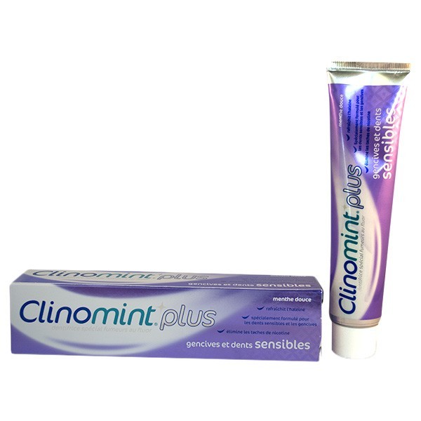 CLINOMINT est un dentifrice spécialement conçu pour les fumeurs aux dents et gencives sensibles. Il vous aide à éliminer en douceur les tâches de nicotine, de tabac, et d aliments sur vos dents. Le dentifrice PLUS GENCIVES ET DENTS SENSIBLES assure une protection de vos dents et de vos gencives sensibles contre les caries. II stimule la fortification de vos dents tout en rafraîchissant votre haleine grâce à la présence de menthe douce.