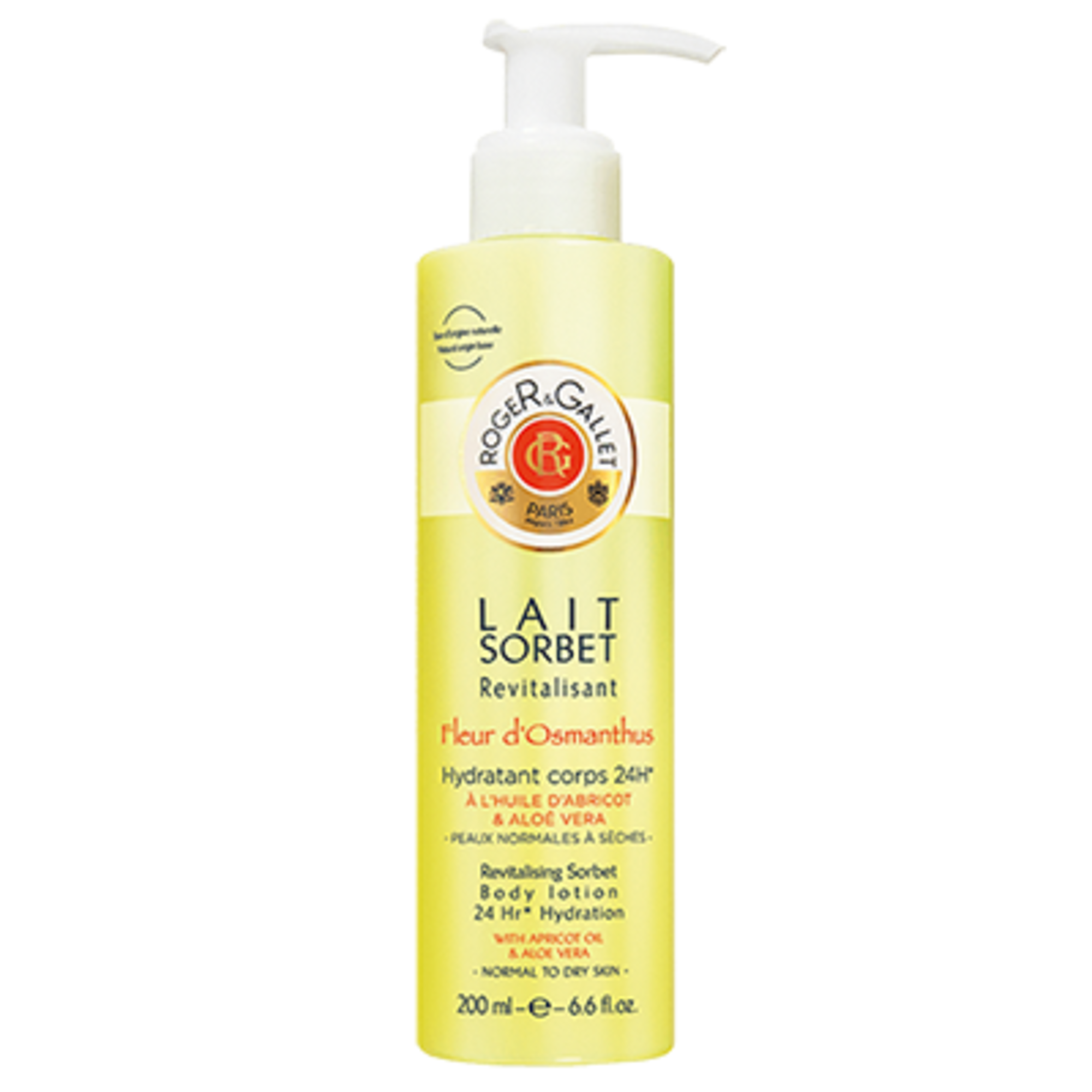 Le LAIT SORBET REVITALISANT de ROGER & GALLET FLEUR D’OSMANTHUS est un nourrissant conçu pour les peaux normales à sèches. À base d’huile d’abricot et d’aloe vera, il hydrate votre peau pendant 24 heures. Enrichi d’un c’ur d’huiles végétales (passiflore, céréales, abricot et avocat), le LAIT SORBET REVITALISANT ROGER & GALLET FLEUR D’OSMANTHUS possède une texture fraîche et légère pour tonifier votre épiderme. Ce lait parfume délicatement votre peau.